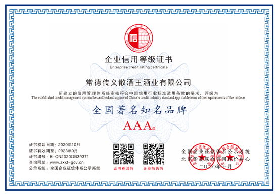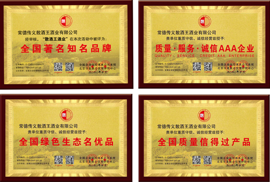 经过多年的深耕发展,现公司荣获国家级多项荣誉称号:国家级品酒师、国家AAA级诚信体系认证、全国生态名优产品质量等证书、“散酒王酒业”获得“中国著名知名品牌”、品质由PICC中国人民保险公司授保等荣誉……